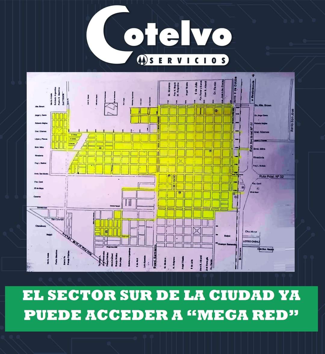 COTELVO Servicios informa que al quedar habilitada la 1ΒΊ etapa del tendido de fibra Γ³ptica en el sector sur de la ciudad, que abarca todas las manzanas comprendidas entre los bulevares Obligado (este) y Sarmiento (oeste), desde la calle 25 de Mayo (norte) hasta la calle San Lorenzo (sur), quienes residen en ese sector -sean o no actuales usuarios de los servicios de telefonΓa e Internet de COTELVO- ya pueden acceder a βMega Redβ.