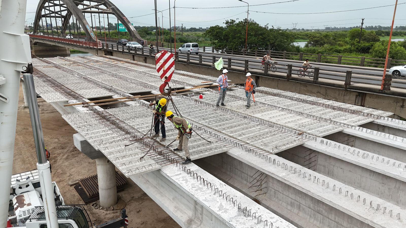 En este sentido, el ministro de Obras Públicas, Lisandro Enrico, contó que “en enero empezamos a darle forma a la superestructura del puente; los vecinos van a poder ir viendo el avance entre vano y vano. Seguimos colgando las vigas con grúas: ya tenemos 15 colocadas, y estamos fabricando y colocando las prelosas. Cerca de finales de mes, empezamos a hormigonar esos tramos sobre las prelosas, que funcionan como un encofrado permanente: sostiene el hormigón y quedan integradas con el puente”.