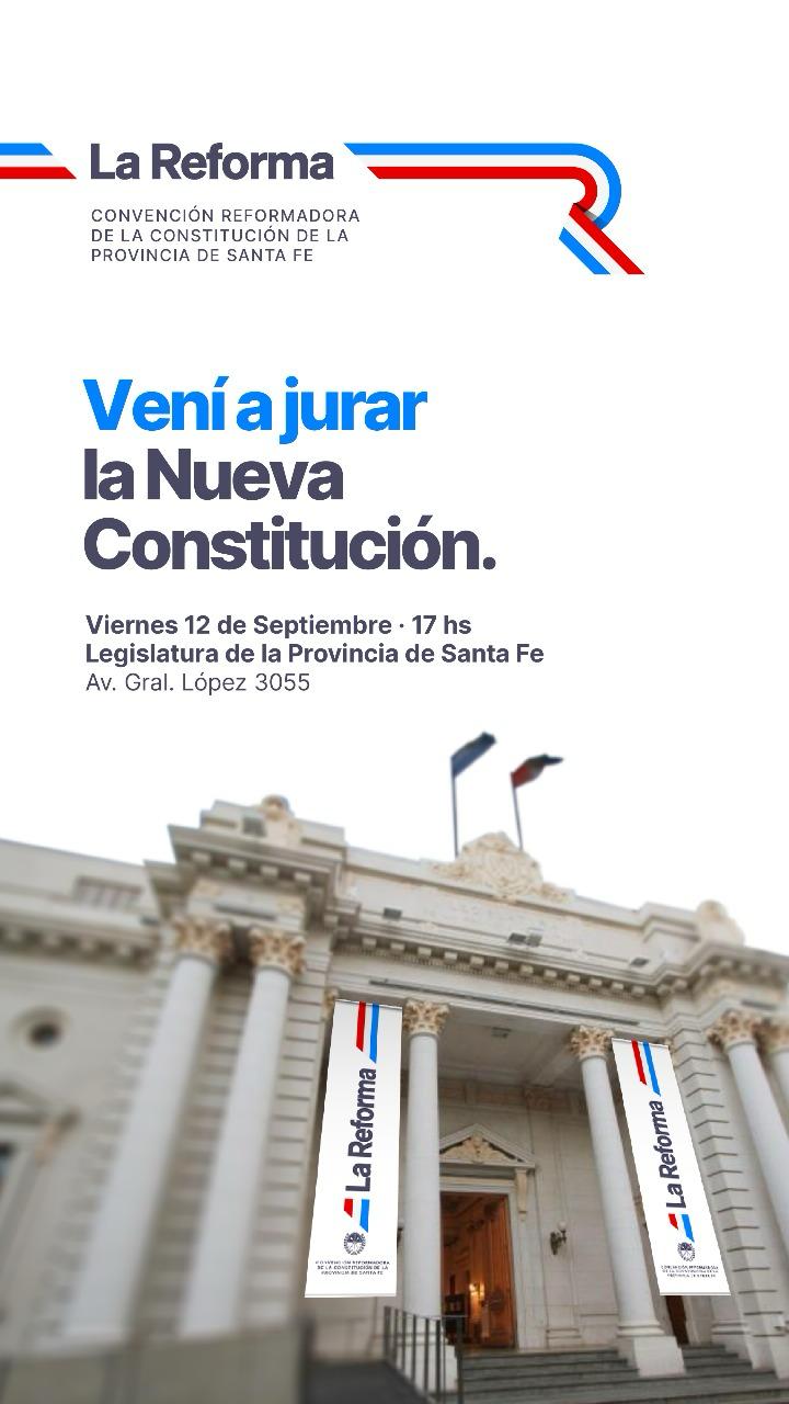 Este viernes 12 de septiembre, a partir de las 17, se realizará el acto oficial de jura de la nueva Constitución de la Provincia de Santa Fe, en el marco del proceso de reforma que culmina tras dos meses de trabajo de la Convención.