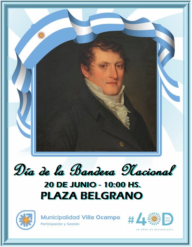 El intendente Enrique Paduán invita al acto oficial por el Día de la Bandera Nacional, que se llevará a cabo el martes 20 de junio, a las 10:00 Hs. en la Plaza “Belgrano”, en conmemoración al 203º Aniversario del Paso a la Inmortalidad del Patriota, Gral Manuel Belgrano, con el siguiente programa: