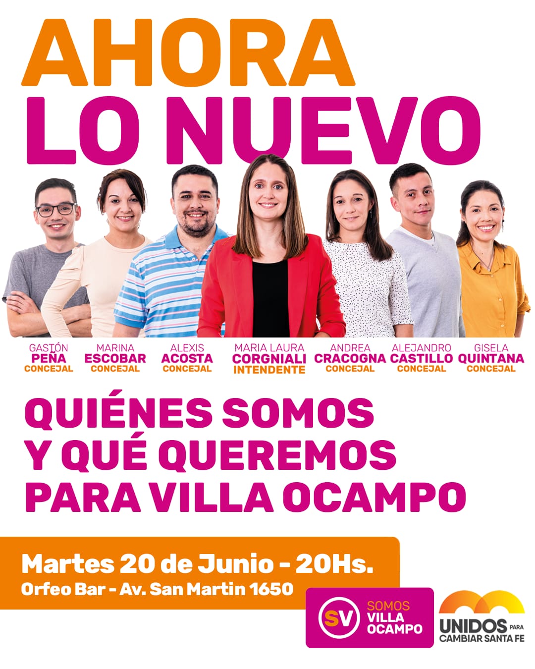 La precandidata a intendente María Laura Corgniali, el precandidato a concejal Alexis Acosta y el resto del equipo invita a toda la ciudadanía y medios de comunicación a participar del lanzamiento de las propuestas de gobierno de Somos Villa Ocampo y conocer a los demás integrantes de la lista a concejales que acompaña a María Laura en las PASO 2023 de nuestra localidad.