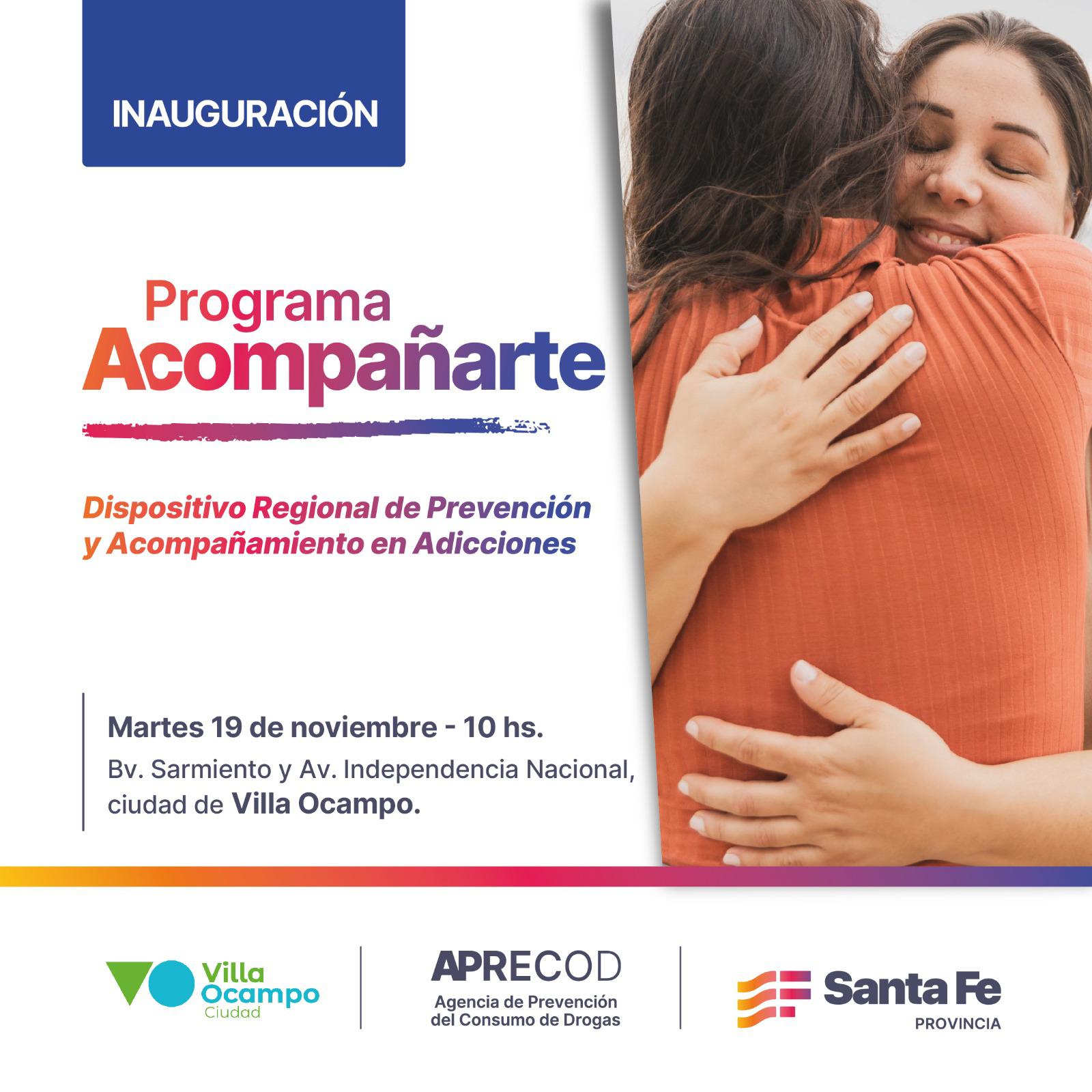 En el marco del programa “Acompañarte” el gobierno provincial inaugurará junto al municipio local el dispositivo terapéutico regional para personas y familias atravesadas por consumos problemáticos. El acto está previsto para este martes 19 de noviembre a las 10 horas en el local de calle Bv. Sarmiento y Av. Independencia Nacional, de la ciudad de Villa Ocampo.