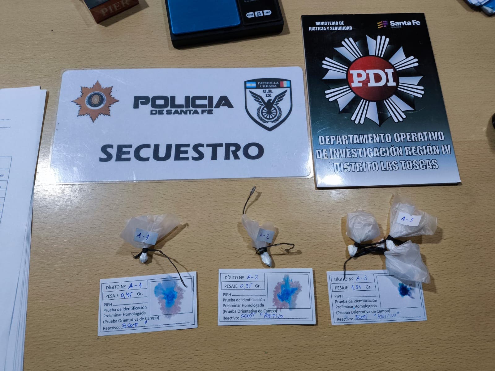 Al realizar la identificación, se encontraron 5 envoltorios de nylon que contenían una sustancia blanquecina pulverulenta similar a la cocaína. El hombre fue trasladado a la sede policial en calidad de aprehendido por el delito de tenencia de estupefacientes, infracción a la Ley 23.737.