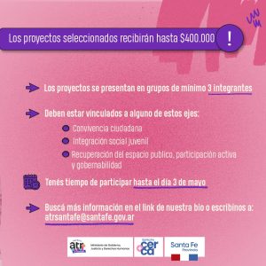 El Gobierno de la Provincia, a través de la Agencia ATR Santa Fe dependiente del Ministerio de Gobierno, Justicia y Derechos Humanos, convoca a grupos de jóvenes entre 15 y 29 años con domicilio en el territorio santafesino, a presentar iniciativas relacionadas con la seguridad ciudadana, con el objetivo de promover las acciones que contribuyan a la buena convivencia y el acceso a sus derechos.