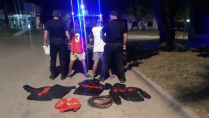 Personal del Comando Radioeléctrico Avellaneda, momentos en que se encontraban realizando patrullaje preventivo en calles 21 y 18, procedieron a la identificación de Dos hombres, mayores de edad, domiciliados en Barrio Belgrano de ese medio. Se incautó en su poder (01) bolso, (03) camperas de color negro y rojo del Club Central Reconquista, (01) camiseta y 12 m de cable.