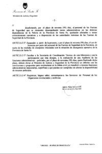Resolución 0002 del Ministerio de Seguridad, que declara el bloqueo de todas las funciones administrativas del personal de las Fuerzas de Seguridad, por lo que quedan afectados a tareas eminentemente operativas; y por otra parte suspende por 90 días el uso de licencias en razón de las medidas de excepción vinculadas con la situación de emergencia.