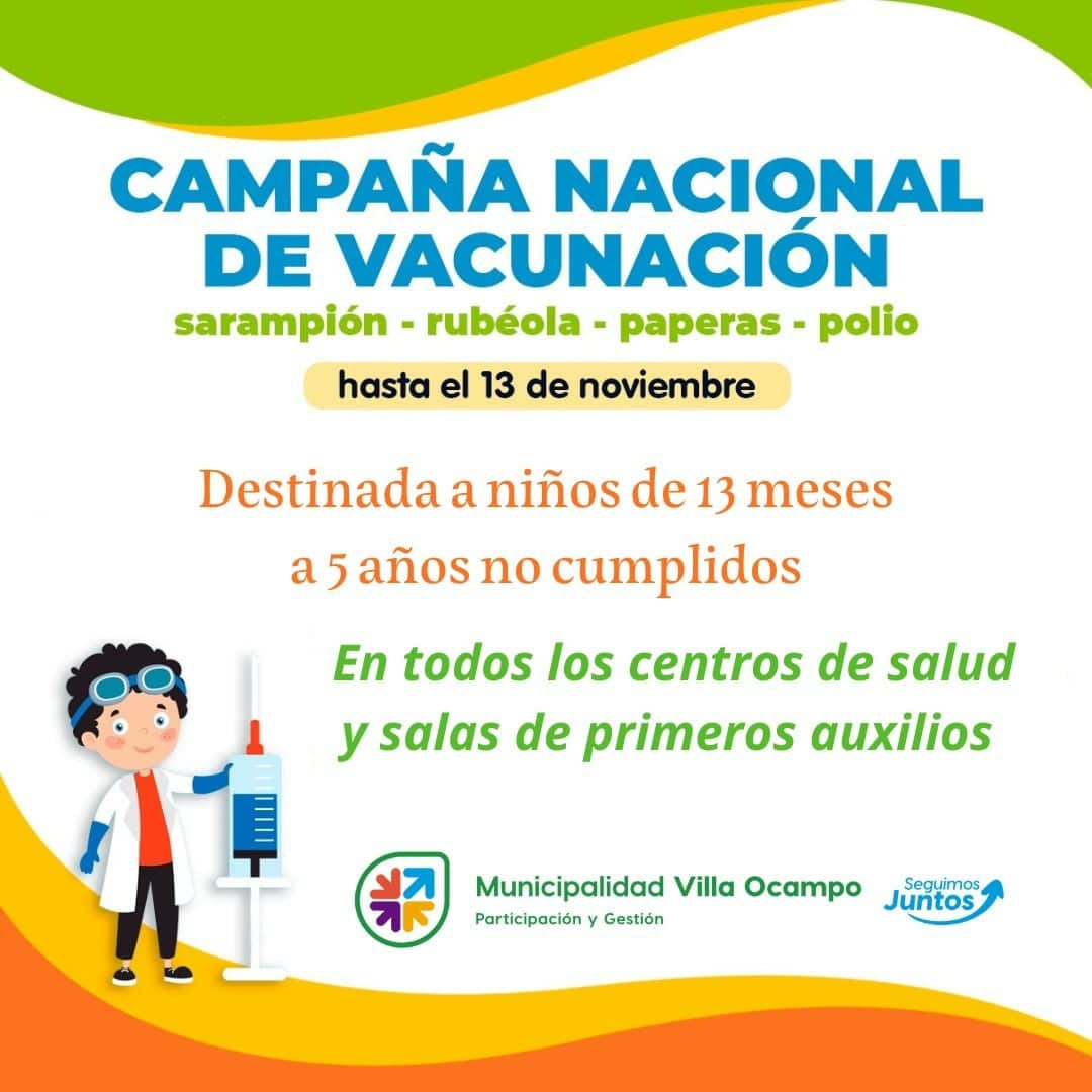 La Secretaría de Desarrollo Social de la Municipalidad de Villa Ocampo informa que a todos los padres de niños desde los 13 meses hasta los cinco años no cumplidos, que hasta el 13 de noviembre se está llevando adelante la campaña de vacunación obligatoria contra el sarampión, rubeola, paperas y polio.