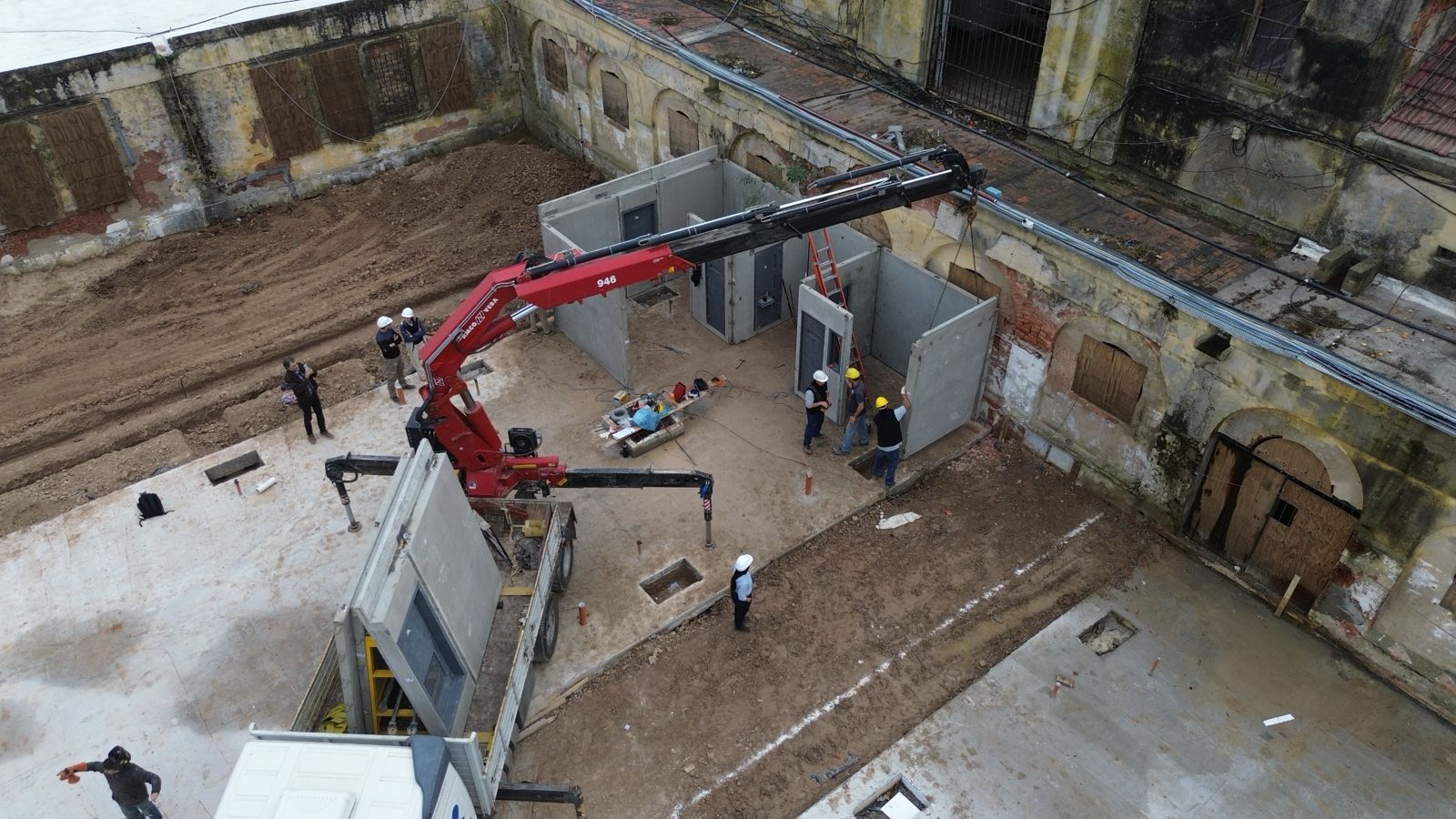 Cabe recordar que, previo a comenzar con el montaje de la panelería prefabricada, la empresa constructora realizó el hormigonado de las plateas donde se están colocando los pabellones. Una vez montados los paneles premoldeados de hormigón armado, se harán, sobre estos, losas que cumplirán la función de cierre superior de seguridad.