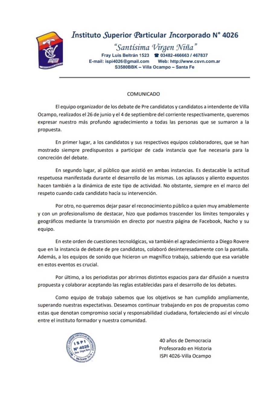 El equipo organizador de los debate de Pre candidatos y candidatos a intendente de Villa Ocampo, realizados el 26 de junio y el 4 de septiembre del corriente respectivamente, queremos expresar nuestro más profundo agradecimiento a todas las personas que se sumaron a la propuesta.