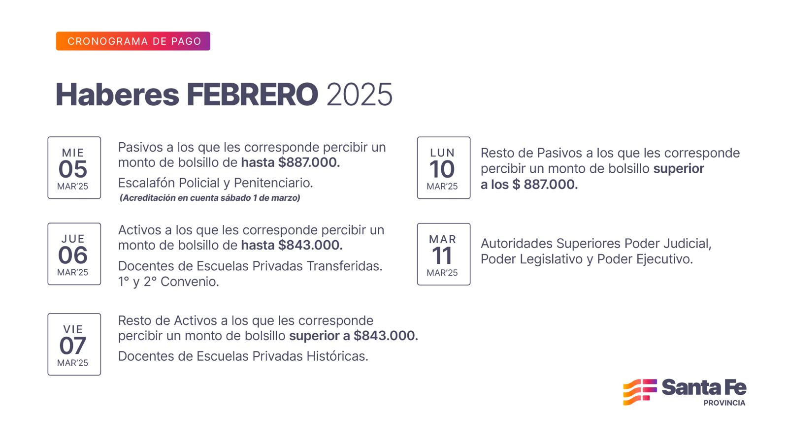 El Gobierno de la Provincia de Santa Fe, a través del Ministerio de Economía, informa que los trabajadores públicos percibirán sus salarios desde el miércoles 5 de marzo, hasta el martes 11.
