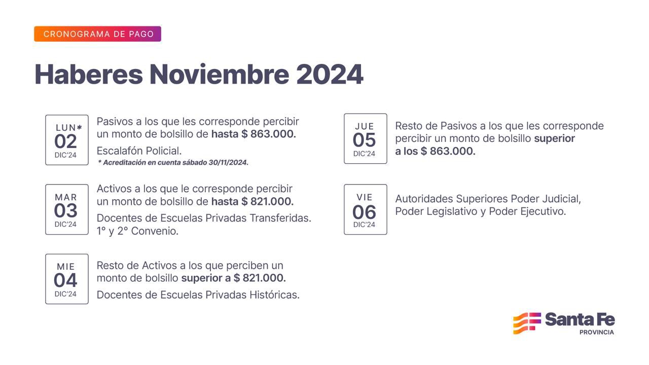 El Gobierno de la Provincia de Santa Fe, a través del Ministerio de Economía, informa que los trabajadores públicos percibirán sus salarios desde el lunes 2 de diciembre hasta el viernes 6.