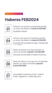 El Gobierno de la Provincia, a través del Ministerio de Economía, informó el cronograma de pago de los haberes del mes de febrero, que se percibirán a partir del viernes 1 y hasta el miércoles 6, en el caso de los agentes públicos; y se completará el jueves 7 para las autoridades superiores de los tres poderes.