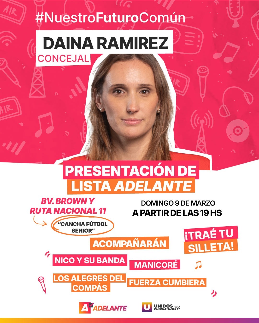 Daina Ramirez, precandidata a concejal por la Lista Adelante del Frente Unidos para Cambiar Santa Fe, invita a la presentación de su equipo, a realizarse el domingo 9 de marzo, a las 19:00 hs., en el predio del Club de Fútbol Senior (Bv. Brown y Ruta Nacional N°11).