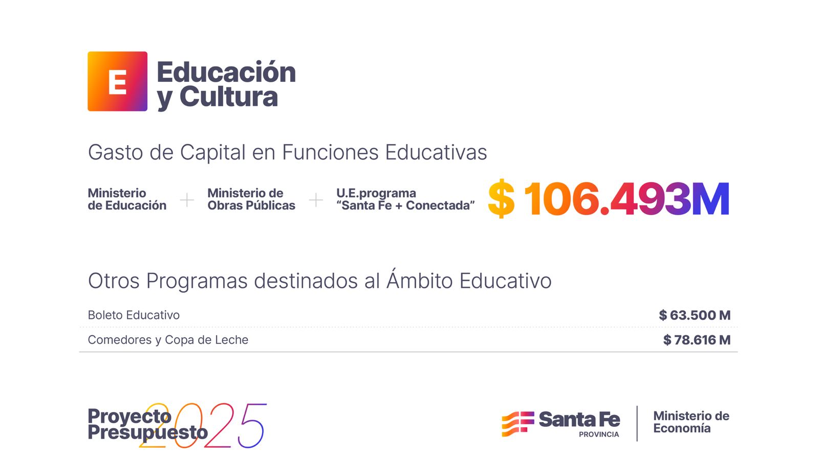 De acuerdo al proyecto que ya fue presentado en la Legislatura, el Ministerio de Educación contará con un presupuesto de $ 2.121.531 millones (2,12 billones de pesos). De ese monto, $ 106.493 millones incluyen erogaciones que se atenderán desde Educación, Obras Públicas y la Unidad Ejecutora que gestiona el programa “Santa Fe + Conectada”. Además de la continuidad del programa 1000 Aulas, habrá inversiones para programas como el Boleto Educativo por $ 63.500 millones, comedores y Copa de Leche por $ 78.616,5 millones, y la construcción y ampliación de 100 edificios educativos y culturales por $ 36.800 millones.