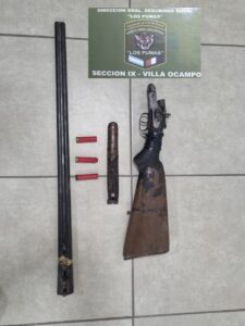 Efectivos de la Sección Nº9, de patrullaje preventivo, por zona rural del paraje Villa Adela, Distrito Villa Ocampo, procedieron a la identificación de una motocicleta, bmarca Suzuki AX 100, en la cual se trasladaba un masculino mayor de edad, quien transportaba (01) escopeta cal. 14 doble caño, (03) cartuchos mismo calibre y (02) ncuchillos, carente de su correspondiente documentación; procedieron al secuestro preventivo de los elementos.