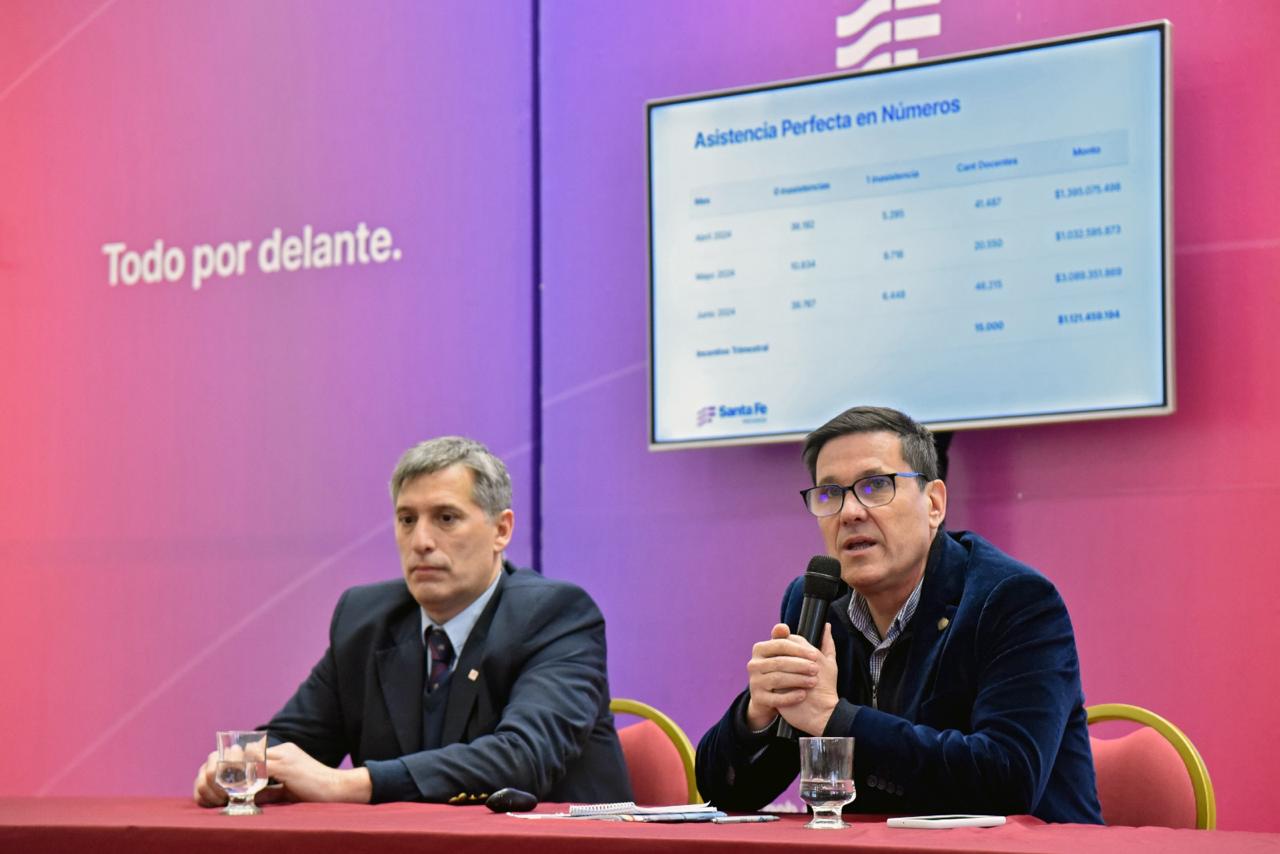 El Gobierno provincial, a través de los ministros de Economía, Pablo Olivares y Educación, José Goity, informó que este martes abonará el monto correspondiente al mes de junio del programa Asistencia Perfecta a 46.112 docentes y directivos de gestión pública y privada. También ese día se pagará el premio trimestral a 15.086 docentes que no faltaron a clases en los meses de abril, mayo y junio. Así, en una conferencia de prensa llevada a cabo en la sede de Gobierno en Rosario, detallaron que la inversión del Estado provincial por el pago del incentivo trimestral, totaliza $1.121.459.194. En tanto que por el pago correspondiente al mes de junio de Asistencia Perfecta, suma una inversión de $ 3.083.210.174.