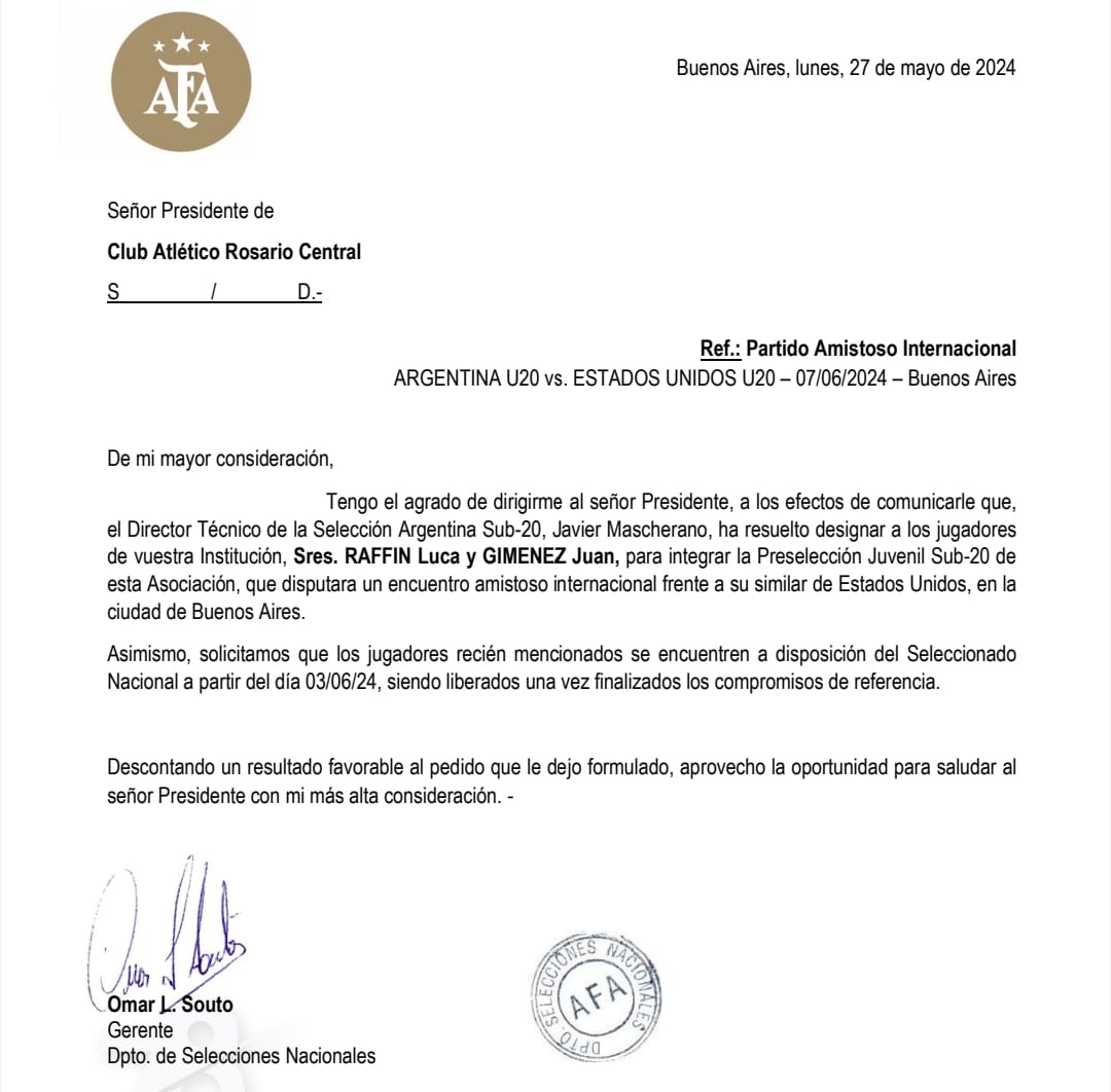 La Asociación del Fútbol Argentino (AFA) ha comunicado formalmente al Club Atlético Rosario Central la convocatoria de sus futbolistas Luca Raffín y Juan Giménez a la Pre-Selección Argentina Sub-20, que disputará un partido amistoso internacional frente a la Selección de Estados Unidos.