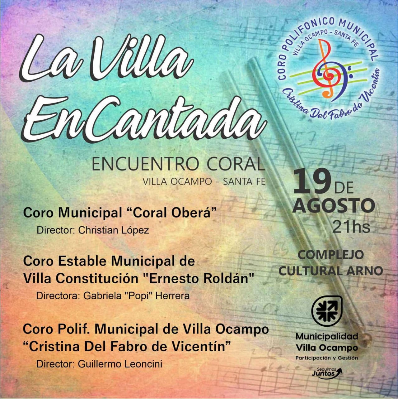 La Secretaría de Cultura y Comunicación de la Municipalidad de Villa Ocampo invita al Encuentro Coral “La Villa EnCantada 2023”, que se llevará a cabo el sábado 19 de agosto, a las 21:00 Hs. en la Sala Bordó del Complejo Arno. Actuarán: