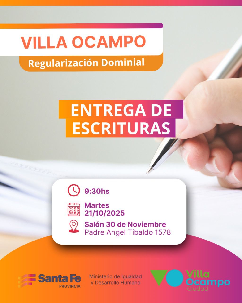 Hoy, martes 21 de octubre, se lleva a cabo en Villa Ocampo el acto de entrega de escrituras en el marco del programa de Regularización Dominial, impulsado por el Gobierno de la Provincia de Santa Fe a través del Ministerio de Igualdad y Desarrollo Humano, junto a la Municipalidad de Villa Ocampo.