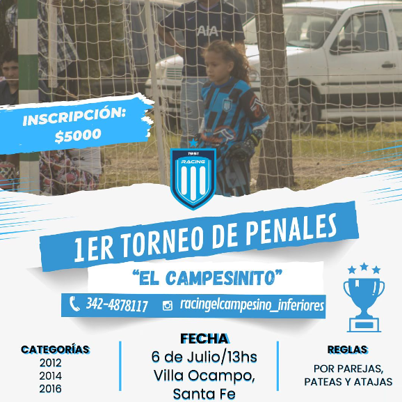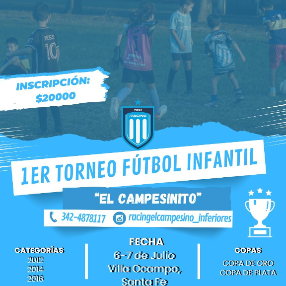 La ciudad de Villa Ocampo se prepara para un evento deportivo relevante, con la organización del primer torneo de fútbol infantil de Racing el Campesino. Según los organizadores, va quedando ya todo en orden, todo preparado para lo que va a ser la primera edición de este torneo. Aseguran estar muy contentos y ansiosos por todo lo que se viene.