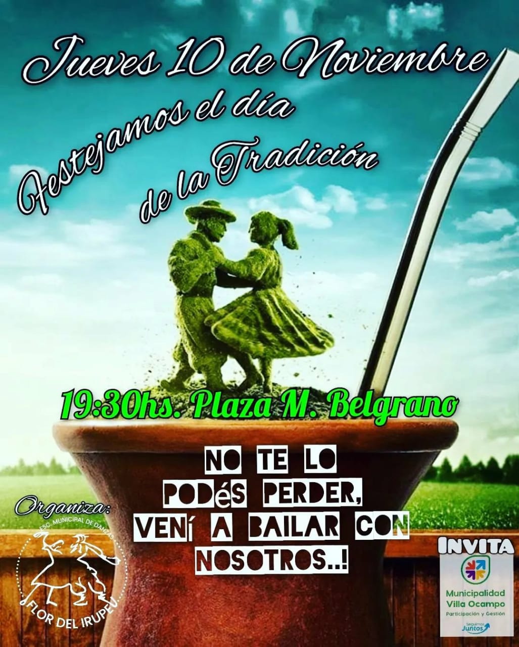 La Secretaría de Cultura y Comunicación de la Municipalidad de Villa Ocampo invita a participar de la Clase Abierta de Danzas Folclóricas que organiza la Escuela Municipal de Danzas “Flor del Irupé”, a realizarse mañana jueves 10 de noviembre “Día de la Tradición”, a las 19:00 Hs. en el Paseo de la Amistad (Plaza Belgrano).