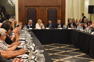Además de más de medio centenar de representantes de las entidades que integran la Multisectorial, participaron del encuentro los ministros de Gobierno e Innovación Pública, Fabián Bastia, y de Desarrollo Productivo, Gustavo Puccini; el Secretario General, Juan Cruz Cándido; la diputada provincial, Clara García, y la presidenta del Concejo de la ciudad de Rosario, María Eugenia Schmuck, entre otros.