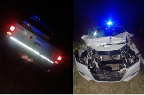 Según manifestó el conductor de la pick up, ambos vehículos circulaban en sentido sur-norte por la Ruta 11, cuando un perro se cruzó de manera imprevista sobre la calzada. Al frenar para evitar embestir al animal, la camioneta fue impactada en su parte trasera por el automóvil que venía detrás.
