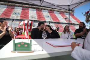 “Muchas veces el fútbol está vinculado a la violencia y desde la Provincia queremos que la familia y el amor puedan ser parte del fútbol”, señaló el secretario de Gestión de Registros, Matías Figueroa. Este martes se celebraron los primeros matrimonios en el estadio Club Atlético Unión, en la ciudad de Santa Fe, bajo el programa “Casate con tu Ciudad como Testigo”.