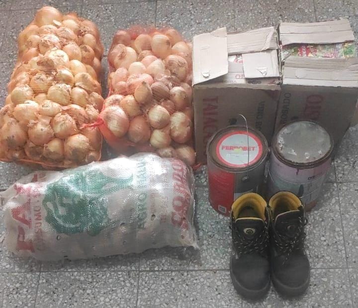 Constituidos en la vivienda de uno de los presuntos involucrados, el propietario hizo entrega voluntaria de dos (02) bolsas de cebollas y una (01) bolsa de papas. Asimismo, otros vecinos realizaron la entrega voluntaria de dos (02) packs de cajas de vino y dos (02) tarros de pintura. En tanto, en barrio Cortada, se procedió al secuestro de un (01) par de borceguíes.