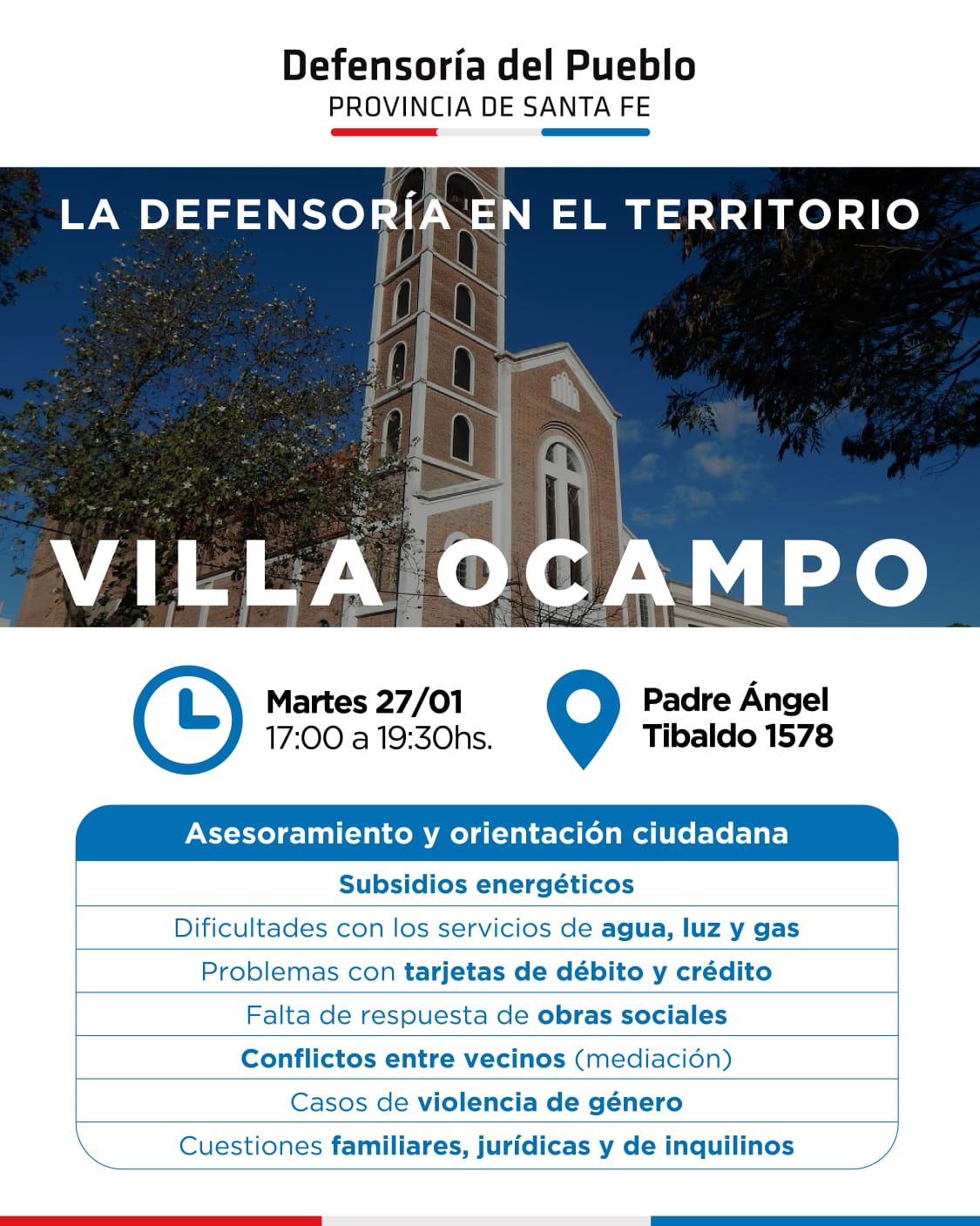 La Defensoría del Pueblo de la Provincia de Santa Fe llevará adelante una nueva jornada de atención territorial en la ciudad de Villa Ocampo, con el objetivo de brindar asesoramiento y orientación ciudadana de manera gratuita.