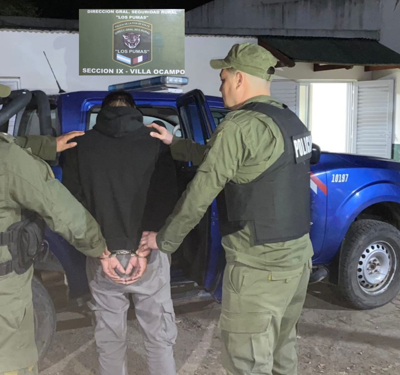 Procedieron a la aprehensión del responsable del hecho a su posterior traslado a la Seccional de la Guardia Rural Los Pumas lugar donde pasó a revestir en calidad de Detenido y seguidamente fue trasladado a la Comisaria 5ta de la UR IX de Las Toscas a la espera de audiencia imputativa y medidas cautelares.