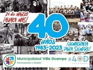 La Municipalidad de Villa Ocampo invita al acto por el “Día de la Memoria, por la Verdad y la Justicia”, que se llevará a cabo hoy jueves 23 de marzo, a las 10:00 Hs. en la Plaza Belgrano, con el siguiente programa: