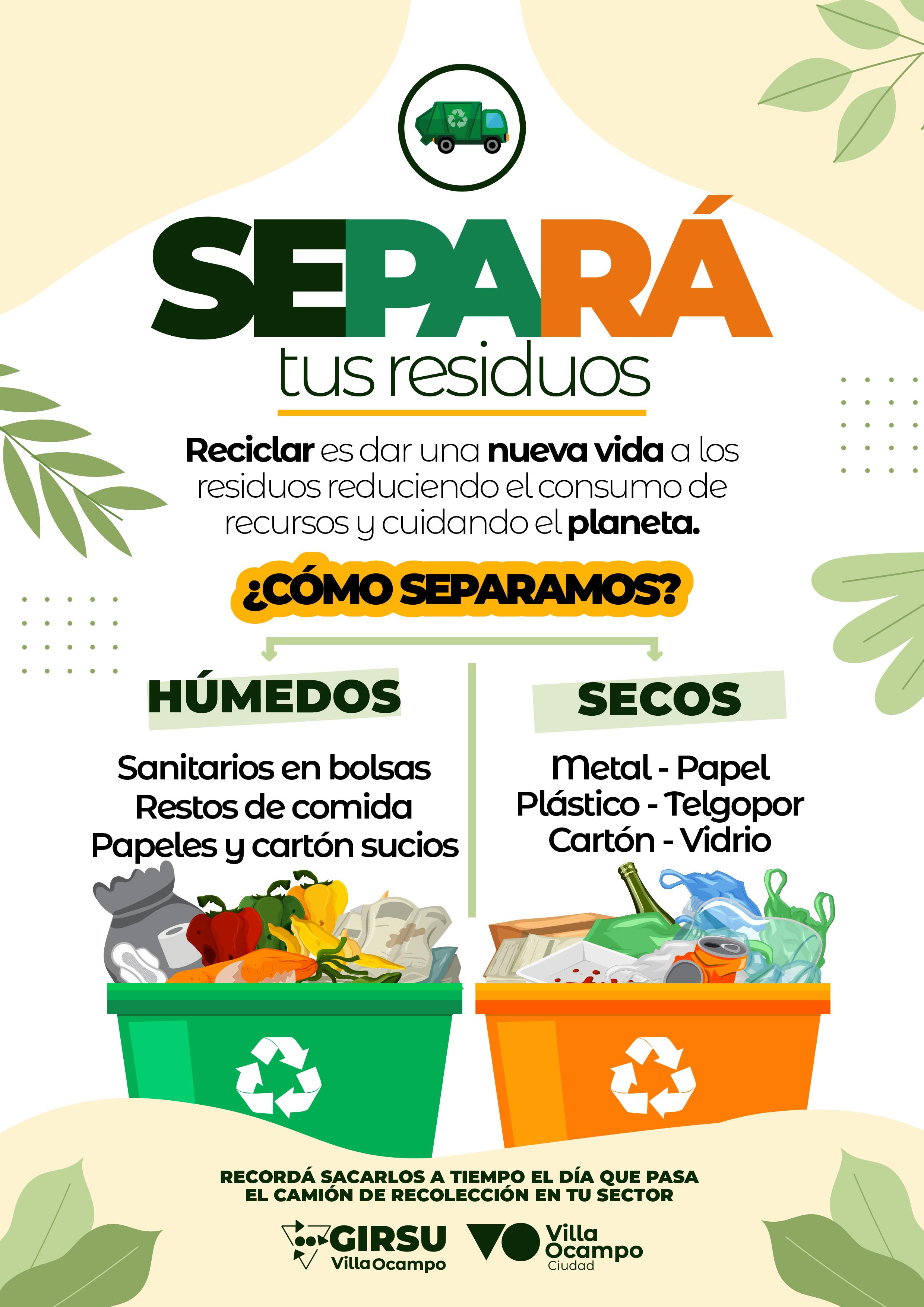 La Municipalidad de Villa Ocampo recuerda a los vecinos la importancia de separar correctamente los residuos para contribuir al cuidado del ambiente. El reciclaje es una acción clave que permite reducir el consumo de recursos y dar una nueva vida a materiales que de otro modo se convertirían en desechos.