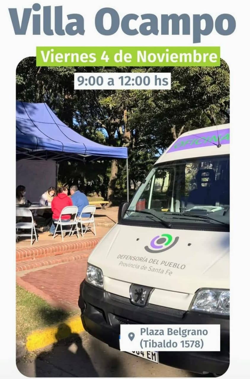 La Secretaría de Gobierno y Seguridad de la Municipalidad de Villa Ocampo y la Oficina Local de Defensa del Consumidor informan que este viernes 4 de noviembre, de 9:00 a 12:00 Hs. atenderá en el Paseo de la Amistad (Plaza Belgrano) la Oficina Móvil de la Defensoría del Pueblo de la Provincia de Santa Fe.