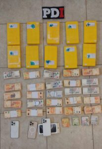 Horas después, efectivos de PDI encontraron el automóvil y a sus ocupantes. Al realizar la requisa, los agentes secuestraron dinero en efectivo en buen estado, dinero mojado y quemado dentro de una conservadora, y un teléfono móvil marca iPhone nuevo en su caja.