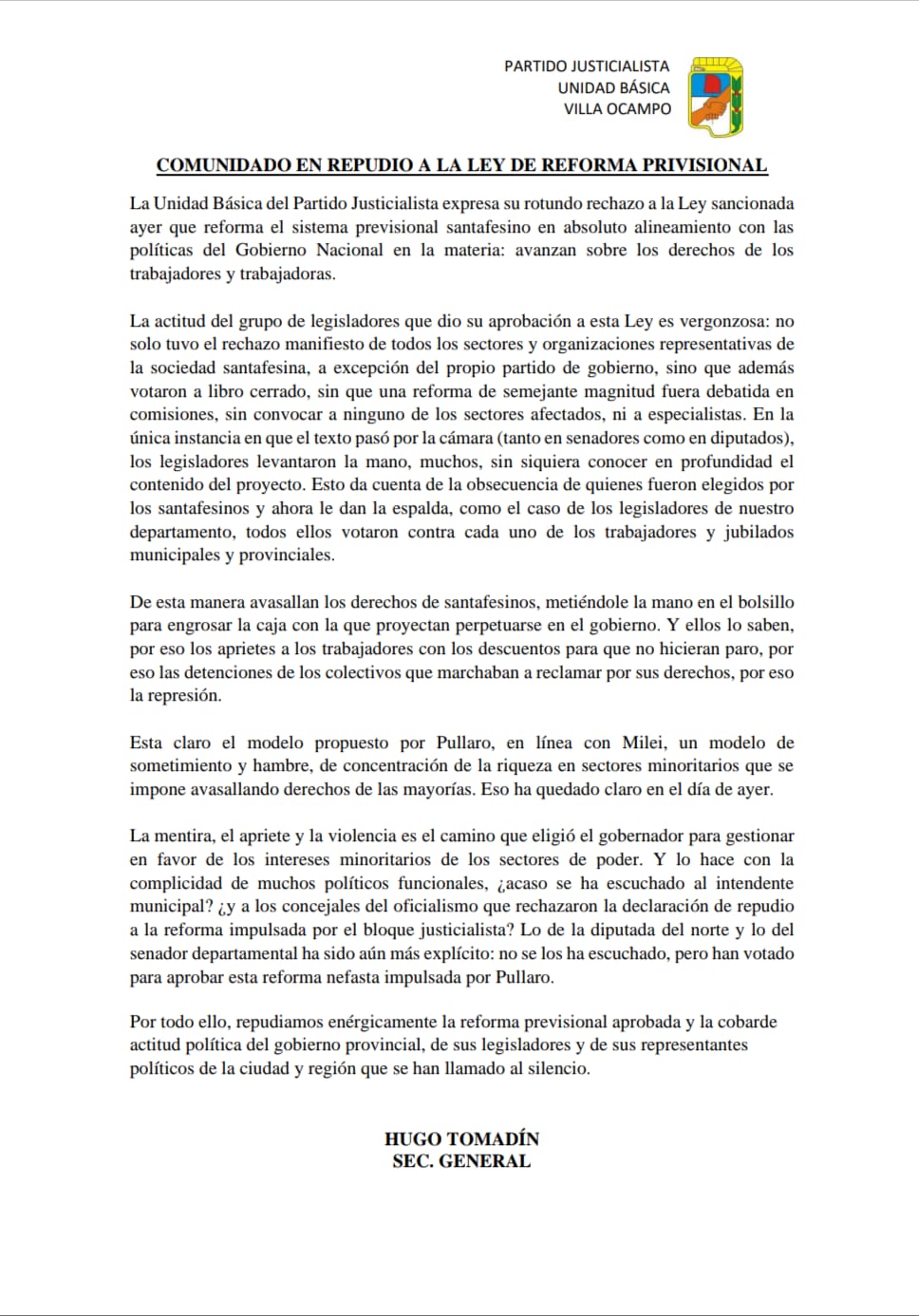 La Unidad Básica del Partido Justicialista expresa su rotundo rechazo a la Ley sancionada