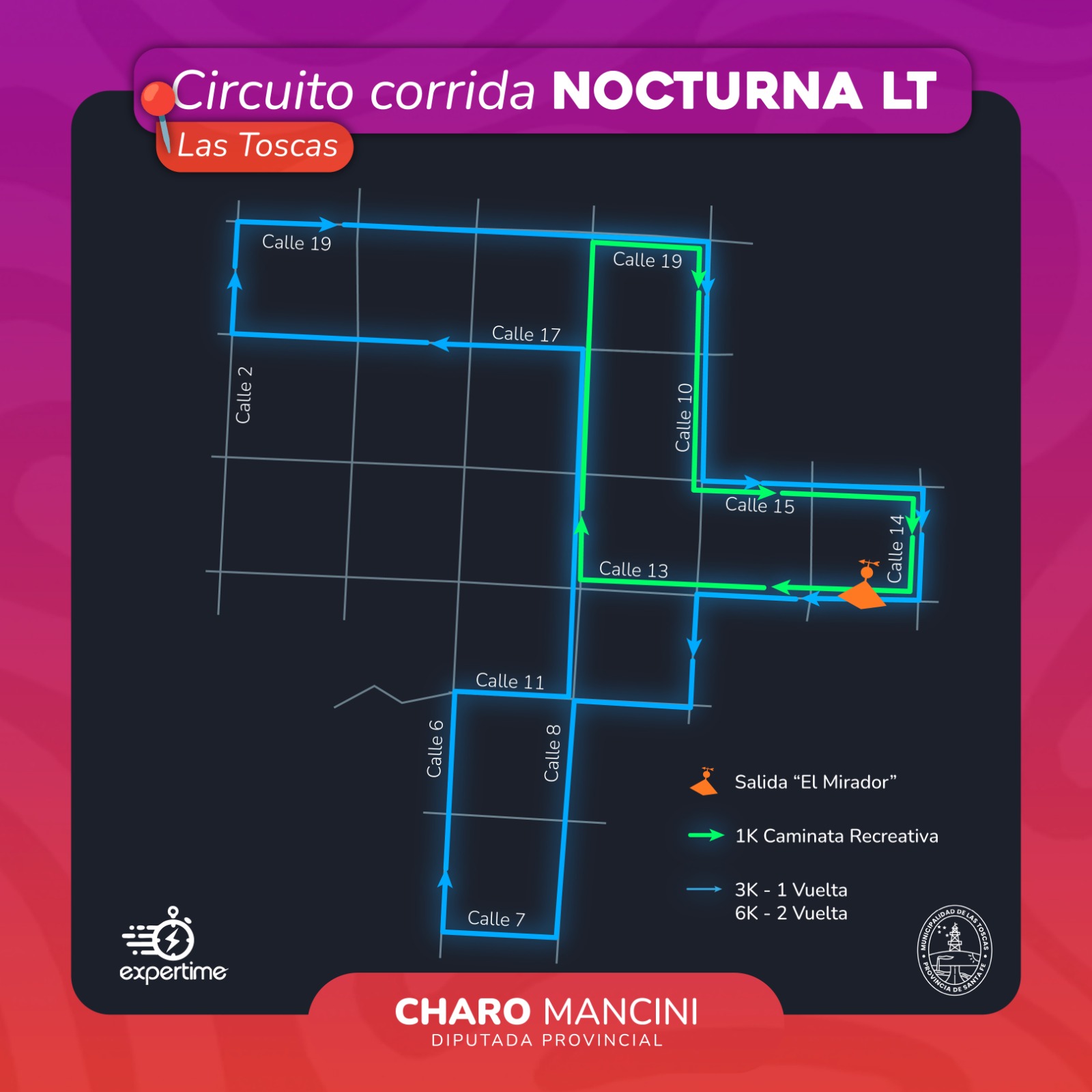 Se informa a vecinos y frentistas que este sábado 18 de abril se realizará la Corrida Nocturna LT en la ciudad de Las Toscas, una iniciativa impulsada por la diputada provincial Charo Mancini junto a la Municipalidad.