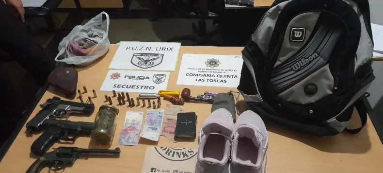 Momento en que la policía patrullaba, por calle 29 entre 8 y 10 de Las Toscas, procedió a la identificación de J.E.G, 28; domiciliado en el Barrio Virgen Niña, quien llevaba una mochila de color negro, y en el interior de la misma los agentes hallaron un revolver, proyectiles, una pistola, un frasco con flores de cannabis, otra mochila, un par de zapatillas de mujer, y 320 pesos, entre otros elementos.