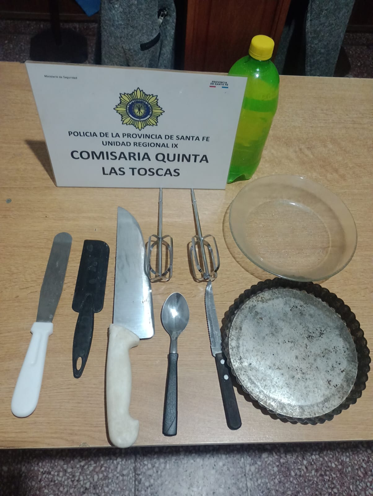 Arribados a una vivienda de Barrio Estación, fueron atendidos por propietario quien autorizó requisa domiciliaria, procediendo al secuestro de (01) cuchillo de carnicero, (01) espátula de plástico, (01) espátula de acero, (01) cuchillo Tramontina, (01) cuchara, (01) plato hondo, (02) accesorios de acero de batidora, (01) litro de detergente, (01) molde de torta.