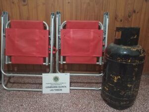 Fecha 04-01-24 – a las 20 h – En sede de la Comisaría 5ta., se labran actuaciones caratuladas a prima facie HURTO CALIFICADO, de fecha 20-12-23, a raíz de una denuncia radicada por Una mujer, mayor de edad, quien adujo que circunstancia que se encontraba en el patio de su vivienda ubicada en calle 15 casa N°73, notó que persona/s ignorada/s previo escalar muro perimetral y sin ejercer fuerza y/o violencia le sustrajeron (02) tubos de gas de 15 kg c/u. Posteriormente amplió su denuncia notando la faltante además de (02) silletas de estructura de aluminio. De tareas investigativas, llevadas a cabo por personal de esa dependencia en conjunto con la Subcomisaría 1ra. Tacuarendí se logró recuperar las dos silletas antes nombradas y un tubo de gas de 15 kg y establecer como autor del hecho a Un hombre, mayor de edad, vecino de ese medio. De diligencias se determinó que no serían ajenos al hecho Otros dos sujetos, citados a esa dependencia por delito de ENCUBRIMIENTO. Se dio conocimiento al Fiscal en Turno.