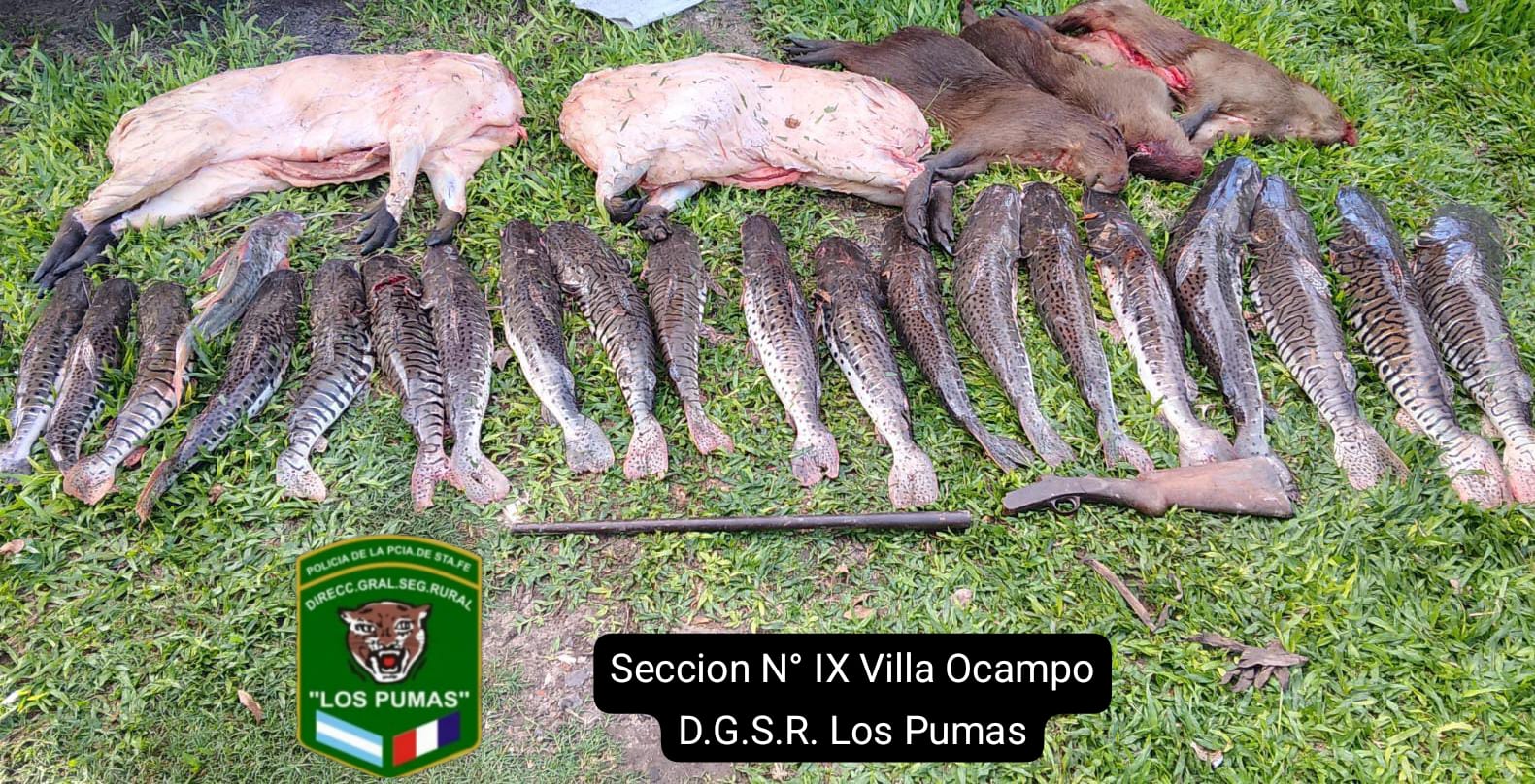 El procedimiento tuvo lugar en zona de islas de la jurisdicción de Villa Ocampo, donde interceptaron una embarcación tipo bote, modelo “Piraña”. Tras la requisa correspondiente, constataron la presencia de fauna ictícola y silvestre fuera de la normativa vigente, procediéndose al secuestro de (02) carpinchos medianos eviscerados, (03) carpinchos borregos eviscerados, (08) surubíes atigrados fuera de medida, (13) surubíes pintados fuera de medida y (01) ejemplar de patí fuera de medida. Asimismo, secuestraron un arma de fuego tipo escopeta, marca Toledo, junto a (02) cartuchos intactos, manifestando uno de los imputados ser propietario de la misma, careciendo de la correspondiente credencial de legítimo usuario.