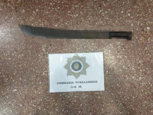 Continuando con la recorrida preventiva, logran entrevistarse con vecinos, quienes adujeron que el involucrado se habría descartado de un machete en una casa en construcción ubicada sobre calle Omar Ramel, al ingresar a la misma hallan el elemento de interés y proceden al secuestro de; un machete de hoja metálico, mango material plástico color negro.