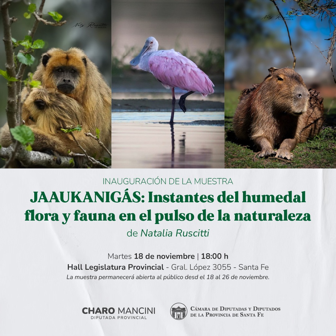 La Diputada Provincial María del Rosario “Charo” Mancini invita a la apertura de la muestra fotográfica “Jaaukanigás: Instantes del Humedal — Flora y fauna en el pulso de la naturaleza”, de la fotógrafa ocampense Natalia Ruscitti, que se inaugurará el martes 18 de noviembre en el Hall de la Legislatura Provincial.