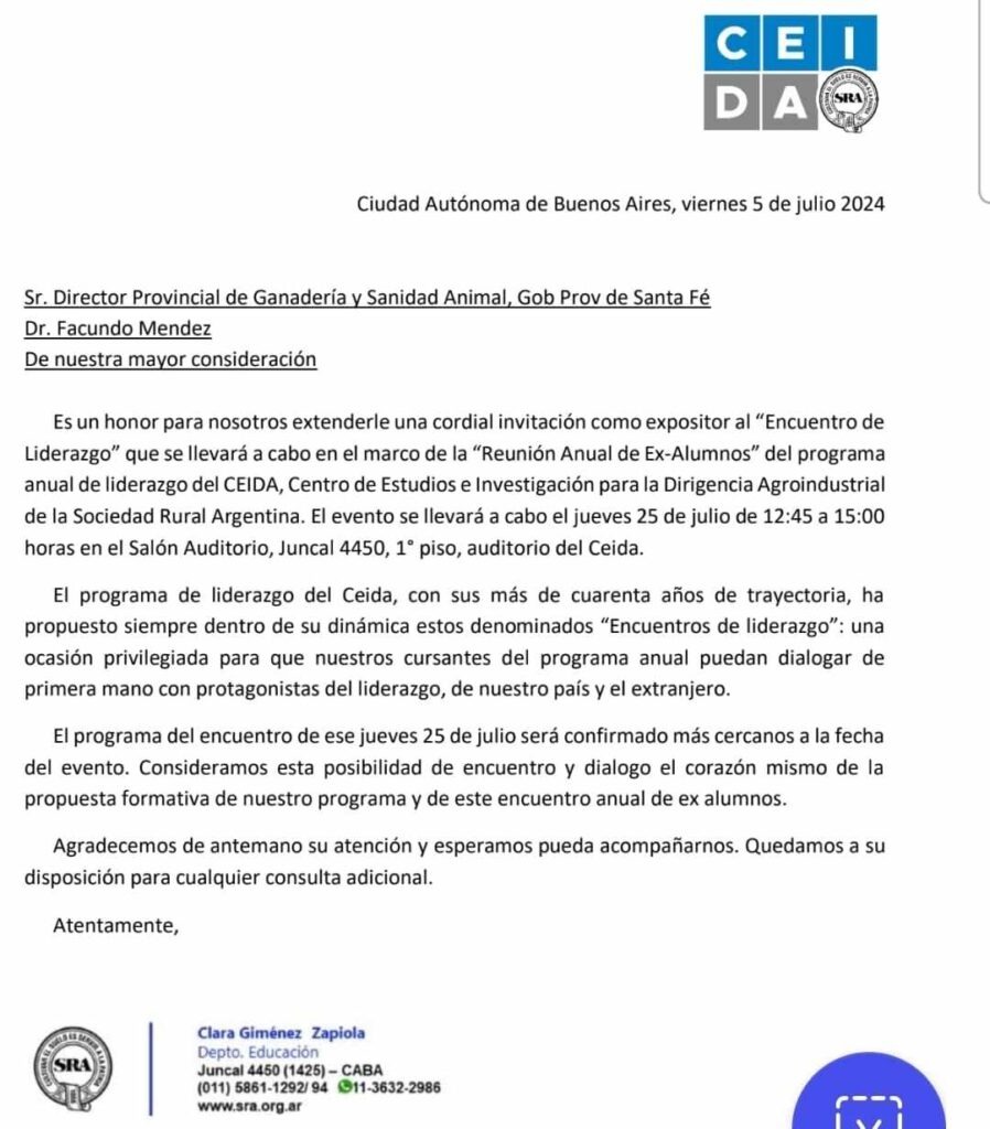 Además Mendez fue formalmente invitado a disertar en el encuentro de Ex Alumnos del CEIDA, que se llevará a cabo el jueves 25 de julio a las 12 hs, en el marco de esta Exposición Rural. El Centro de Estudios e Investigación para la Dirigencia Agroindustrial (CEIDA) es una propuesta de la Sociedad Rural Argentina para la formación y capacitación de dirigentes vinculados a la actividad agroindustrial y a entidades intermedias. El programa comprende materias de formación y capacitación. Los egresados conforman hoy una extensa red con participación ejecutiva y legislativa, tanto a nivel nacional como provincial, colaborando también en municipios, sociedades rurales, organismos estatales, ONGs, cooperativas; como protagonistas del destino del país y del sector agroindustrial.