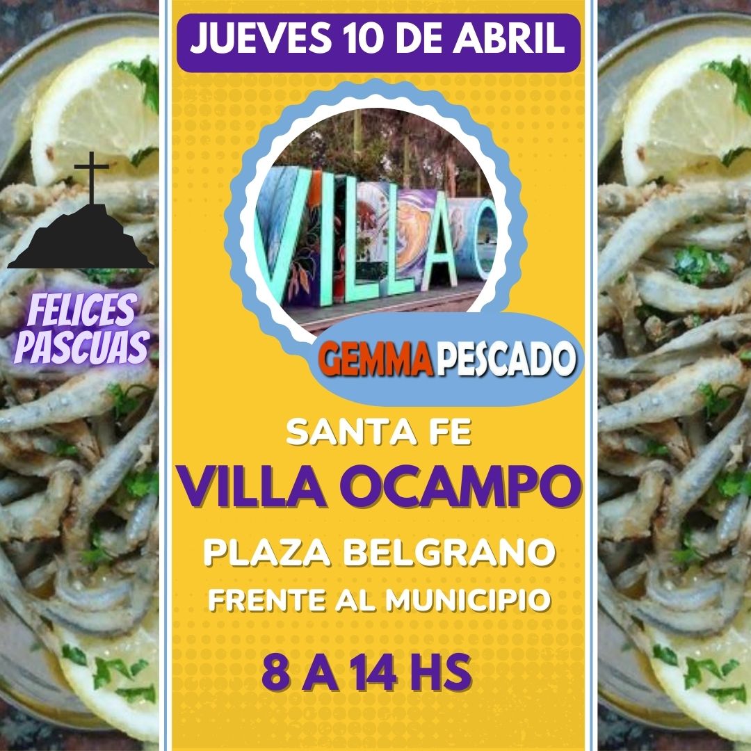 La Municipalidad de Villa Ocampo informa que este jueves 10 de abril, de 8:00 a 14:00 Hs. en Plaza Belgrano, frente al Palacio Municipal, estará nuevamente el camión de “Gemma Pescado”, ofreciendo una gran variedad de pescados de mar.