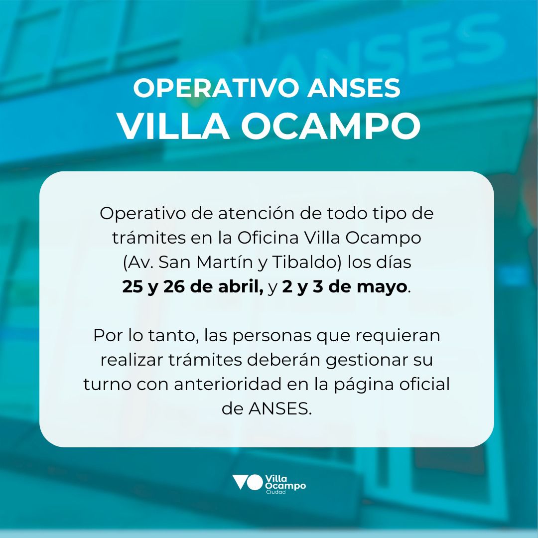 La Municipalidad de Villa Ocampo informa que desde ANSES Litoral Santa Fe se organizó un operativo de atención de todo tipo de trámites en la Oficina Villa Ocampo (Av. San Martín y Tibaldo) los días 25 y 26 de abril, y 2 y 3 de mayo.