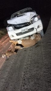 Inmediatamente los uniformados se hacen presente al lugar corroborando la veracidad del incidente, el cual tuvo como protagonista a un animal vacuno, categoría vaca, pelaje pampa colorado, la misma se encontraba sin vida sobre la vía de circulación y sobre ella la camioneta involucrada, presentando daños a