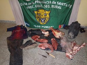 Efectivos de la Guardia Rural Los Pumas, con asiento en la localidad de Huanqueros, a raíz de una denuncia radicada por parte de un ciudadano mayor de edad, quien manifestó ser encargado de un Establecimiento rural ubicado en la localidad de La Lucila, y que realizando la recorrida habitual escuchó disparos de arma de fuego; al acercarse al lugar, divisó a dos masculinos que se retiraban con armas y un animal porcino; motivo por el cual la prevención actuante realizó arduas tareas investigativas, procedieron a requisa domiciliaria por orden del Sr Fiscal en turno, en un campo lindero constataron productos cárnicos de especies silvestres relacionados al acto de cacería efectuado, como así también