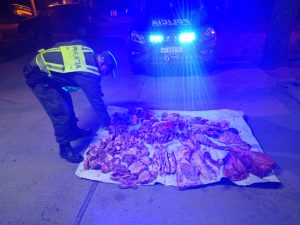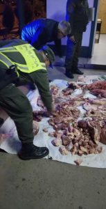 En consecuencia de la inspección de un vehículo automóvil decomisaron 80 kgs (ochenta Kilogramos) aproximadamente de diferentes cortes cárnicos de la especie bovina, cabeza, viseras y embutido.