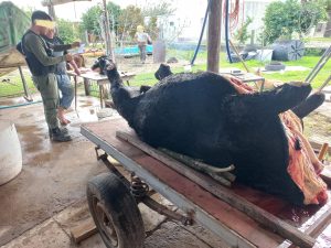 En el lugar realizaron una requisa autorizada por su morador y constataron la presencia de un animal vacuno recientemente faenado de manera clandestina sin autorización de los entes reguladores y sin respetar las medidas de seguridad alimentaria exigidas.